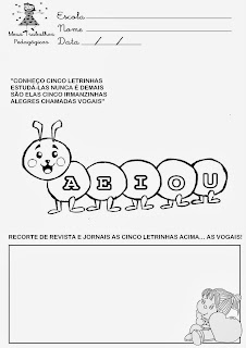 Nesta atividade estamos reconhecendo as Vogais, em um período de manha a professora fez com eles o recorte da Vogal "A", hoje fizemos o recorte da Vogal "E", e durante as semanas seguintes devemos terminar esta tarefinha. Através desta atividade o objetivo é o reconhecimento e identificação das vogais junto com coordenação motora estimulada a partir do recorte....não se preocupe com a bagunça que a sala de aula fica, é um bom momento para ensinar os pequeninos a manter nosso ambiente limpo e arrumado sendo assim solicite aos que vão terminando a ajudar a limpar.